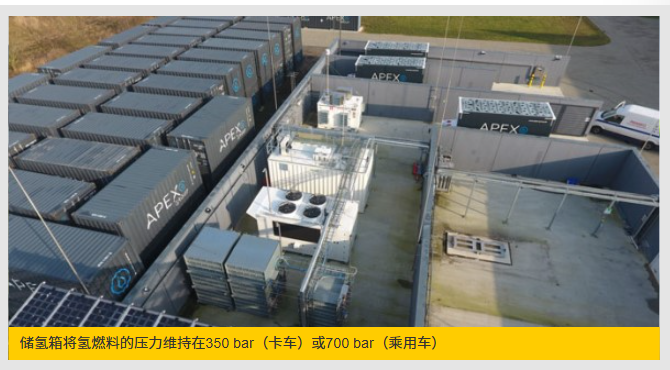 長(zhǎng)管拖車內(nèi)的氫氣分三個(gè)階段壓縮至350 bar后冷卻。然后儲(chǔ)存在為卡車補(bǔ)充燃料的儲(chǔ)氫箱中,或者在第四個(gè)壓縮階段將氫氣壓縮至700 bar并儲(chǔ)存在單獨(dú)的儲(chǔ)罐中。由于預(yù)先對(duì)氫氣進(jìn)行了冷卻,因此可通過(guò)700-bar的泵更快地為乘用車補(bǔ)充燃料。