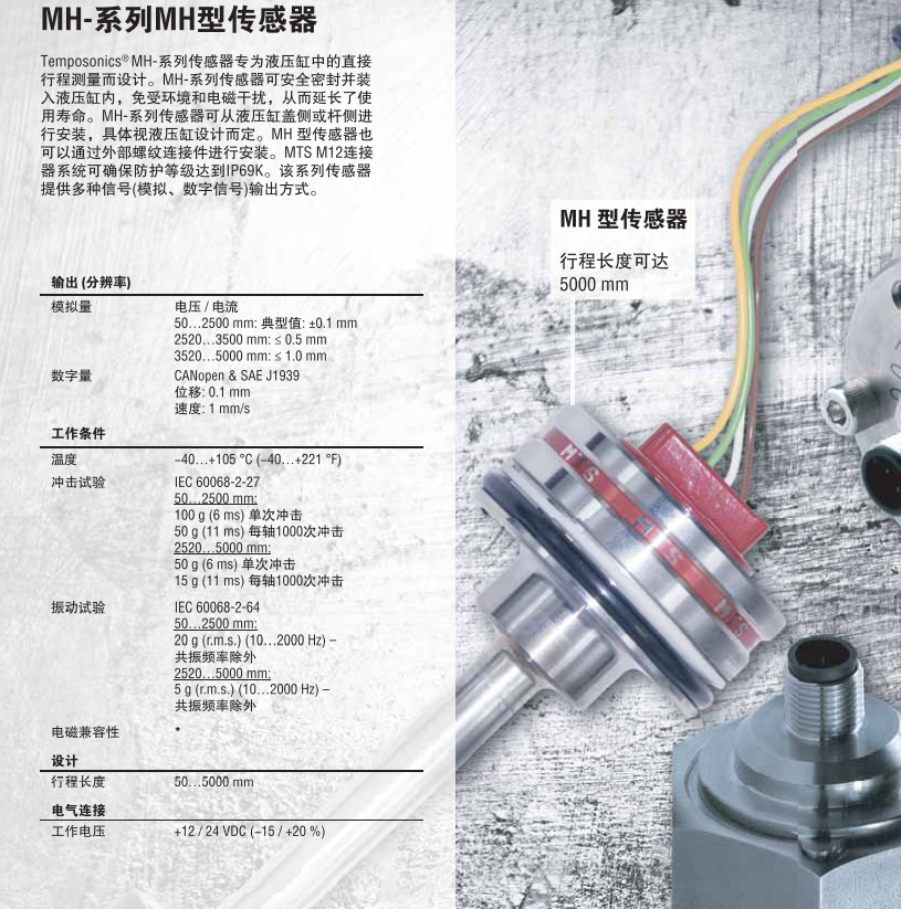 Temposonics MH-系列傳感器專為液壓缸中的直接行程測(cè)量而設(shè)計(jì)。MH-系列傳感器可安全密封并裝入液壓缸內(nèi),免受環(huán)境和電磁干擾,從而延長(zhǎng)了使用壽命。MH-系列傳感器可從液壓缸蓋側(cè)或桿側(cè)進(jìn)行安裝,具體視液壓缸設(shè)計(jì)而定。MH型傳感器也可以通過外部螺紋連接件進(jìn)行安裝。MTS M12連接器系統(tǒng)可確保防護(hù)等級(jí)達(dá)到IP69K。該系列傳感器提供多種信號(hào)(模擬、數(shù)字信號(hào))輸出方式。