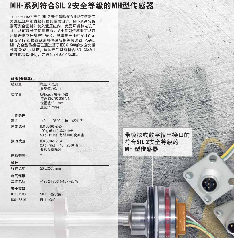 Temposonics符合SIL 2安全等級(jí)的MH型傳感器專為液壓缸中的直接行程測(cè)量而設(shè)計(jì)。MH-系列傳感器可安全密封并裝入液壓缸內(nèi),免受環(huán)境和電磁干擾,從而延長(zhǎng)了使用壽命。MH-系列傳感器可從液壓缸蓋側(cè)或桿側(cè)進(jìn)行安裝,具體視液壓缸設(shè)計(jì)而定。MTS M12連接器系統(tǒng)可確保防護(hù)等級(jí)達(dá)到IP69K。MH安全型傳感器已通過基于IEC 61508的安全完整性等級(jí)(SIL)認(rèn)證,這些產(chǎn)品具有符合ISO 13849-1的性能等級(jí)(PL),并符合EN 954-1標(biāo)準(zhǔn)。輸出(分辨率)
