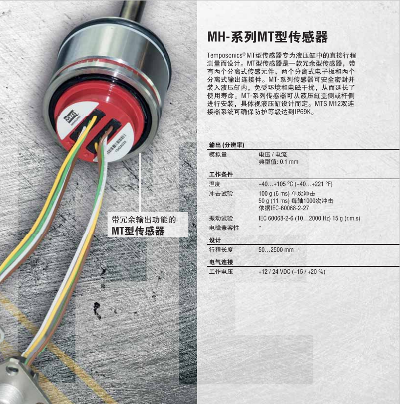 Temposonics MT型傳感器專為液壓缸中的直接行程測(cè)量而設(shè)計(jì)。MT型傳感器是一款冗余型傳感器, 帶有兩個(gè)分離式傳感元件、兩個(gè)分離式電子板和兩個(gè)分離式輸出連接件。MT-系列傳感器可安全密封并裝入液壓缸內(nèi),免受環(huán)境和電磁干擾,從而延長(zhǎng)了使用壽命。MT-系列傳感器可從液壓缸蓋側(cè)或桿側(cè)進(jìn)行安裝,具體視液壓缸設(shè)計(jì)而定。MTS M12雙連接器系統(tǒng)可確保防護(hù)等級(jí)達(dá)到IP69K。輸出(分辨率)