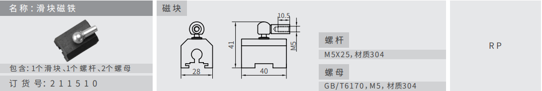 名稱 :滑塊磁鐵 訂貨 號:211510 包含:1個滑 塊 、1個螺桿 、2個螺?