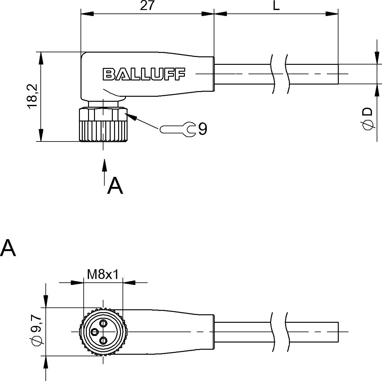 接口 M8x1母頭,彎頭,3針,A編碼