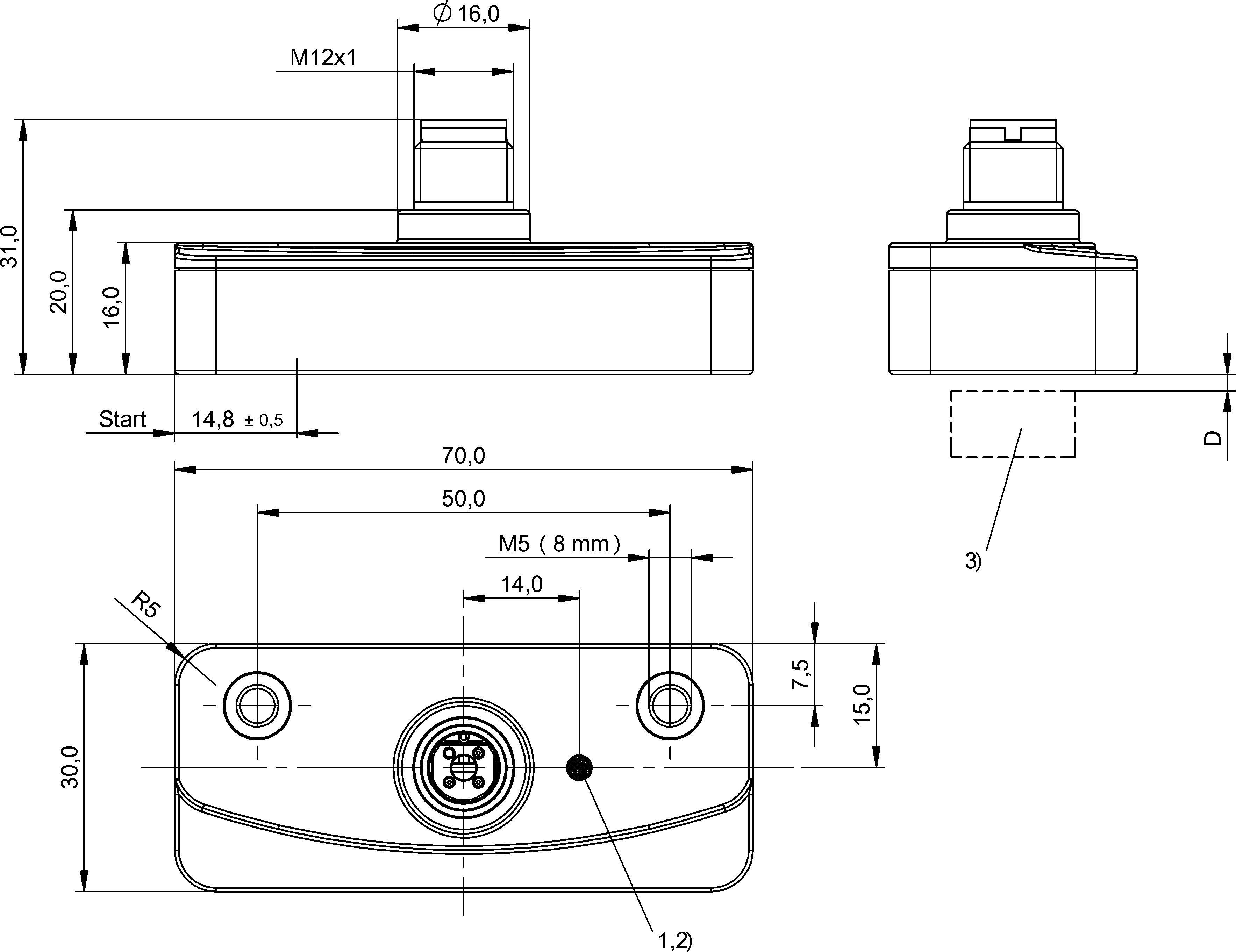 1) LED功能顯示, 2) LED功能顯示, 3) 位置傳感器